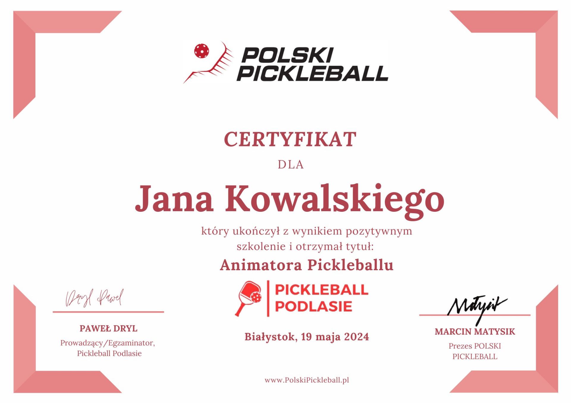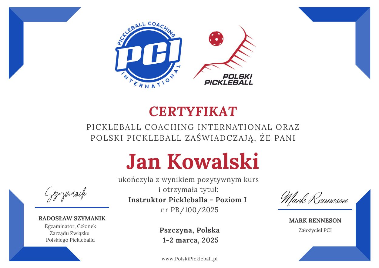 - Certyfikat Związku Polskiego Pickleballu (ZPP),
